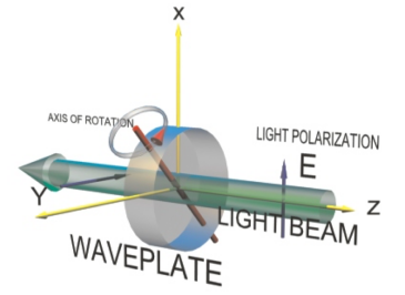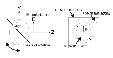 旋转螺丝,直至获得所需的相位延迟。所需相位延迟是通过将延迟片围绕某一轴倾斜 8°-15°(具体角度取决于光谱区域)来实现的,该轴所在平面与光偏振方向成 45° 角(见图)。