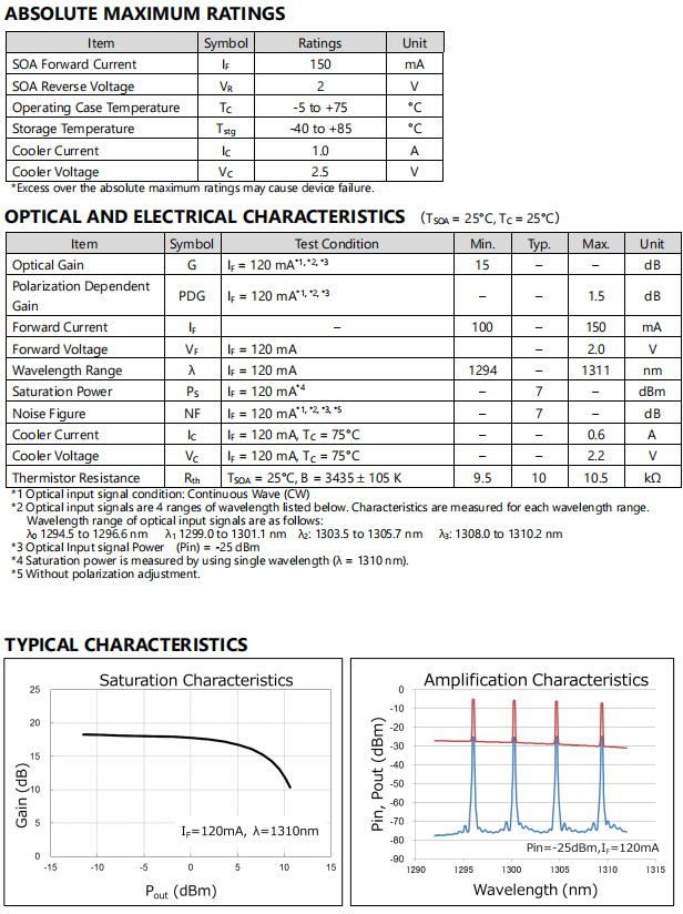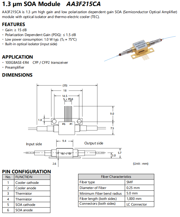 特点:光学增益:15dB或更高(输入-25 dBm,120 mA)