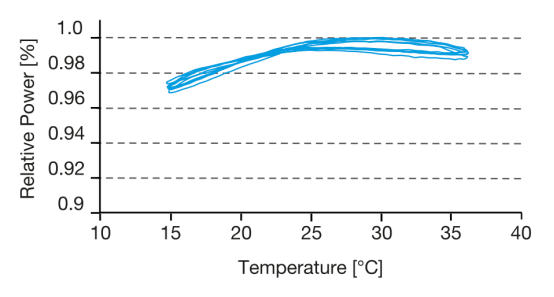 其紧凑的尺寸以及高分辨率的对准机制使耦合过程简单直观。因此,光纤耦合具有较高的热稳定性、指向稳定性,且抗振动、抗冲击。长期稳定性测试(见右侧图表)表明,在15-35°C的温度范围内,功率稳定性优于3%。