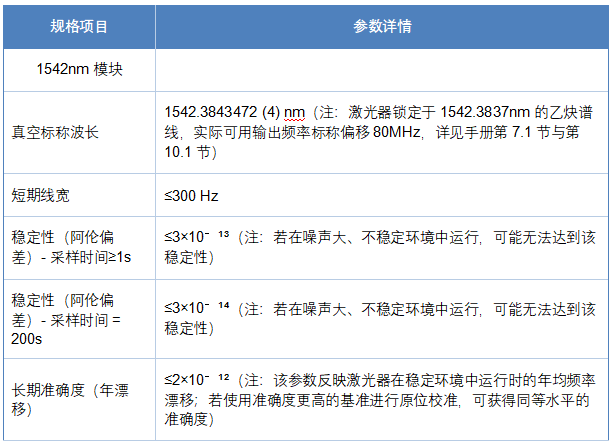 Stabilaser 1542ε 的核心是一款紧凑型超低噪声光纤激光器,其稳频参考为乙炔分子 P (16)(v1 + v3)跃迁线,对应真空波长 λ=1542.38371238nm,换算频率为 f=c/λ=194369569384kHz(注:受内部调制影响,激光输出频率偏移 80MHz)。
