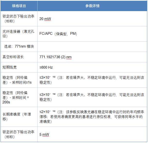 通过将 Stabilaser 1542ε 与全光纤基倍频技术结合,可额外获得 771nm 波长的激光输出。该方案能确保 771nm 激光信号继承 Stabilaser 1542ε 的优异短期线宽与长期稳定性。此外,该产品支持后续升级此倍频方案,升级后可同时提供 771nm(5mW 功率)与 1542nm(20mW 功率)的激光输出。