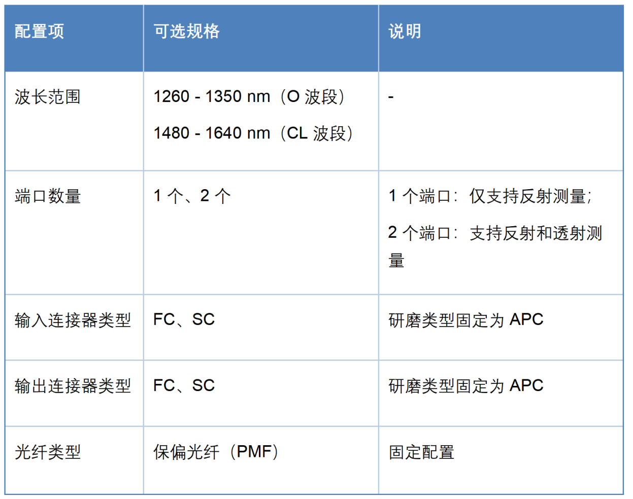产品提供两种配置:O 波段(1260 nm - 1350 nm)和 CL 波段(1480 nm - 1640 nm)。