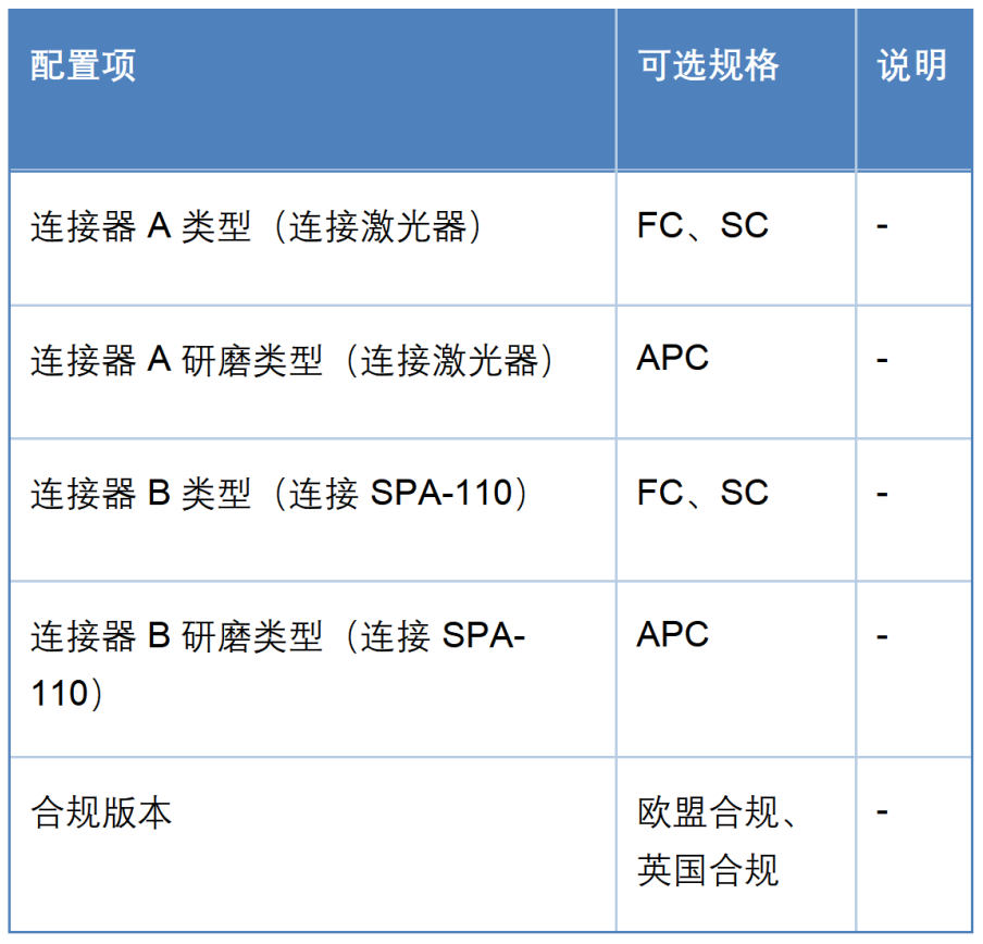 需单独订购保偏光纤跳线,用于连接可调谐激光器与 SPA-110。订购代码需根据激光器输出端的连接器 / 研磨类型,以及 SPA-110 输入端的连接器 / 研磨类型确定,具体规格如下:
